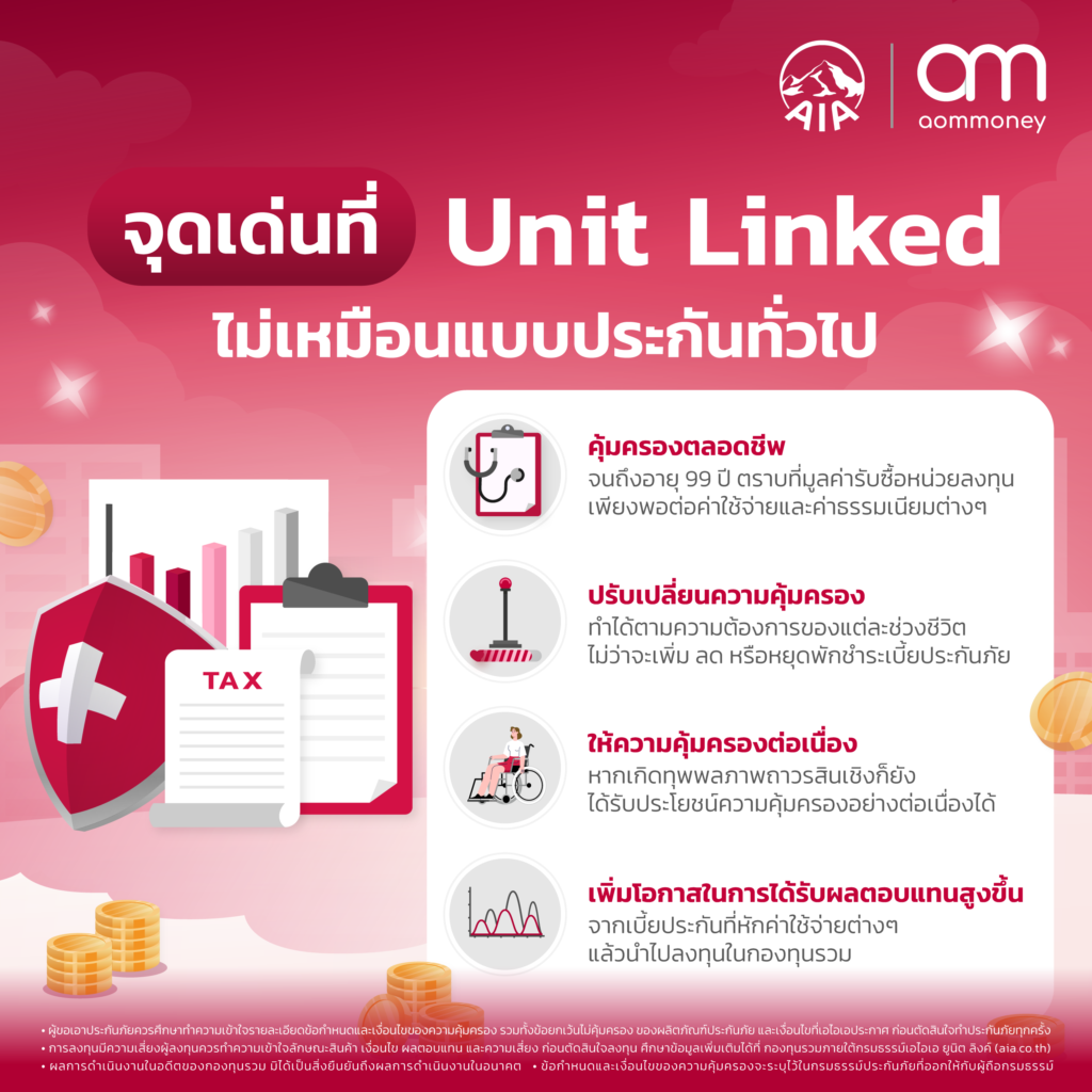 ·        การทำประกันชีวิตแบบยูนิต ลิงค์ ไม่ใช่การฝากเงินและมีความเสี่ยง ผู้ขอเอาประกันภัยควรทำความเข้าใจลักษณะสินค้า เงื่อนไขผลตอบแทน และความเสี่ยง รวมถึงศึกษา อ่าน และทำความเข้าใจในเอกสารประกอบการเสนอขายและหนังสือชี้ชวนของกองทุน ก่อนตัดสินใจทำประกันภัยและลงทุน ซึ่งผู้ขอเอาประกันภัยอาจได้รับเงินคืนมากกว่าหรือน้อยกว่ามูลค่าเบี้ยประกันภัย ที่ถูกจัดสรรเข้ากองทุนรวม โดยหากผลการดำเนินงานของกองทุนรวมมีกำไร