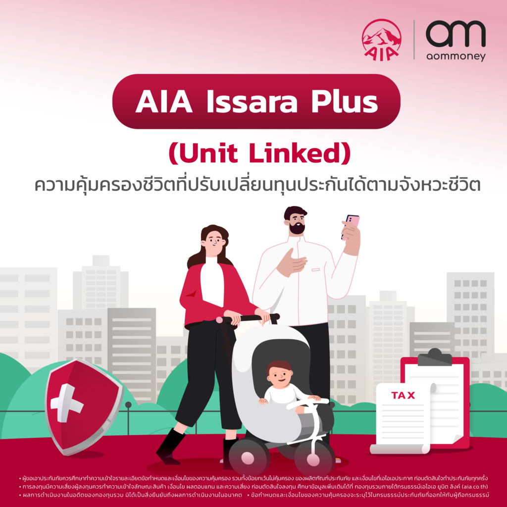 AIA Issara Plus (Unit Linked) ที่มอบทั้งความคุ้มครองชีวิตและต่อยอดเป้าหมายทางการเงินด้วยการลงทุน และสามารถทำสัญญาเพิ่มเติมค่ารักษาพยาบาลเพื่อคุ้มครองเราอย่างรอบด้านได้อีกด้วย นี่ถือเป็นอีกหนึ่งทางเลือกของการวางแผนด้านการเงิน ให้คุณวางแผนชีวิตได้อย่างอิสระ ปรับเปลี่ยนความคุ้มครองได้ตามจังหวะชีวิตของคุณเอง