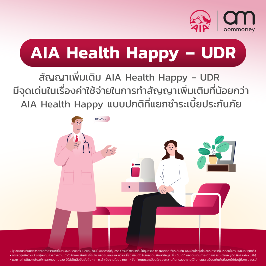 แบบประกัน AIA Health Happy – UDR (สัญญาเพิ่มเติม) เป็นสัญญาเพิ่มเติมสุขภาพแบบเหมาจ่ายที่ครอบคลุมค่าใช้จ่ายตามแผนค่ารักษาพยาบาลที่ต้องการ